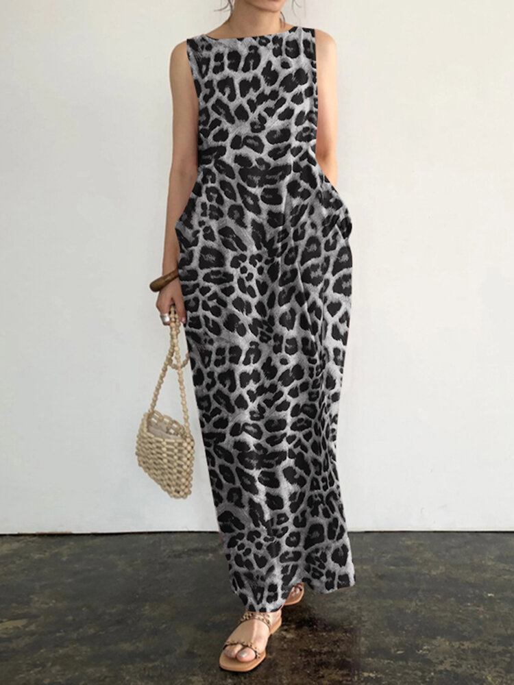 Ærmeløs Maxikjole Med Leopardtryk Med Rund Hals