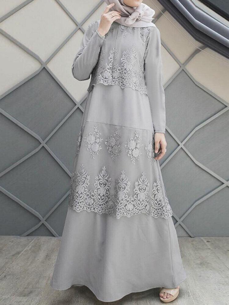 Blondesøm A-linje O-hals Ensfarvet Langærmet Muslimsk Kjole Abaya Kaftan Til Kvinder