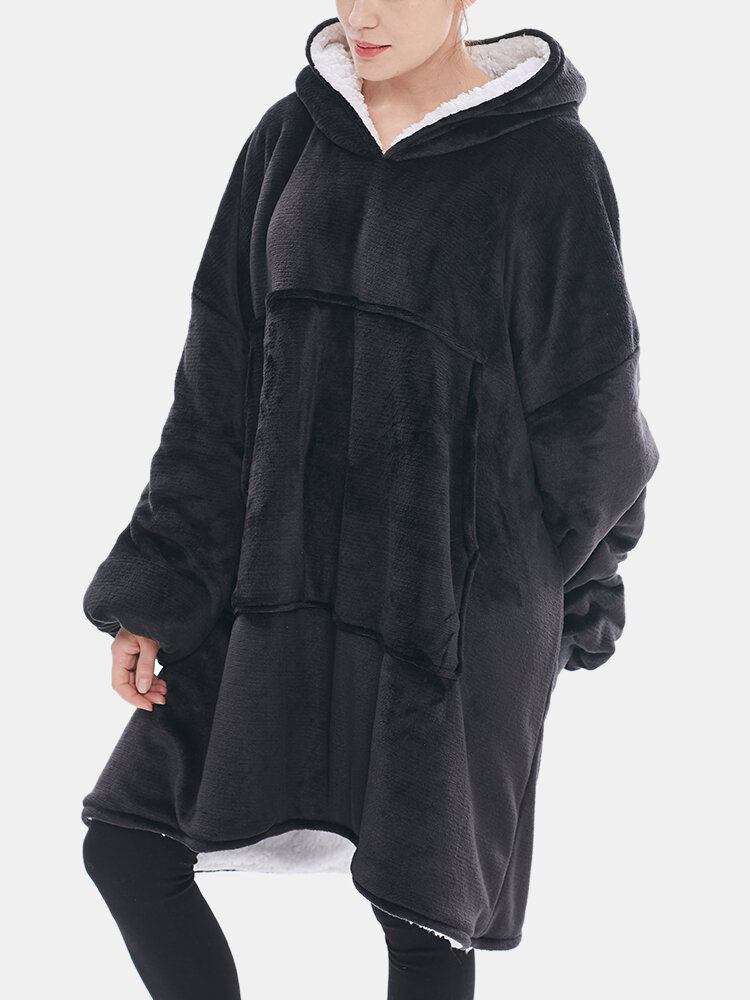 Dame Flannel Oversized Fleeceforet Tæppe Hættetrøje Med Kængurulomme