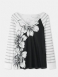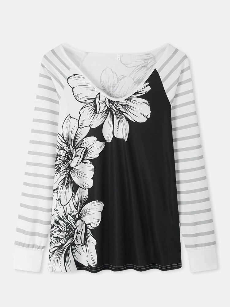 Dame Stribet Blomsterprint Raglanærmet Bluse Med V-hals