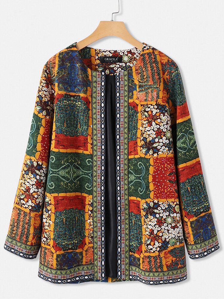 Etnisk Stil Blomsterprint Patchwork Langærmede Vintagefrakker Med Lommer