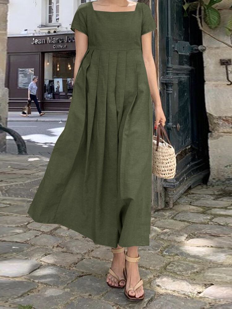 Kortærmet Firkantet Hals Plisseret Solid Midikjole