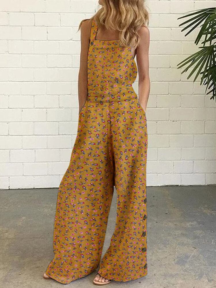 Kvinder Bomuld Blomsterprint Sideknap Bredt Ben Ærmeløse Vintage Jumpsuits Med Lomme