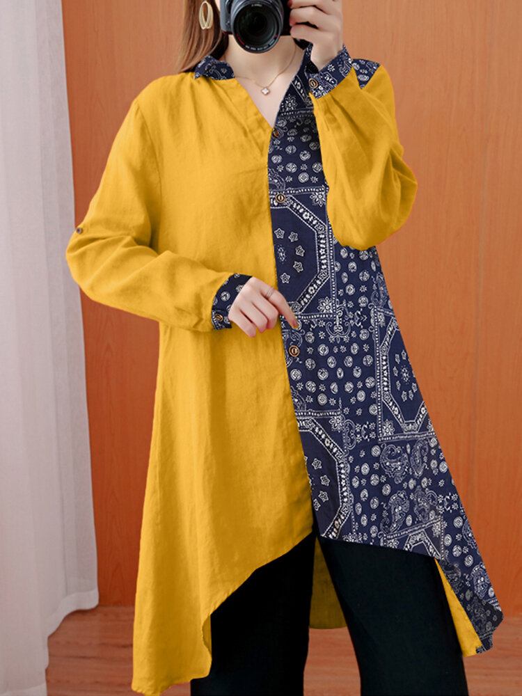 Kvinder Etnisk Mønster Print Patchwork Uregelmæssig Søm Langærmet Reversbluse