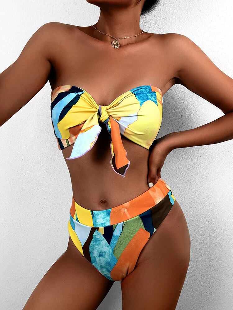 Kvinder Farverigt Print Tie Front Bandeau Stropløse Bikinier Med Thong