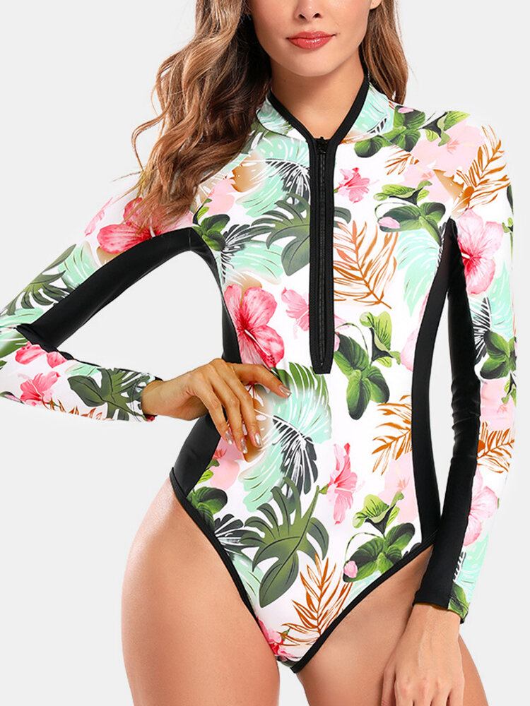 Kvinder Patchwork Blomsterprint Lynlås Højhals Langærmet Slankende Surfing One Piece Badetøj