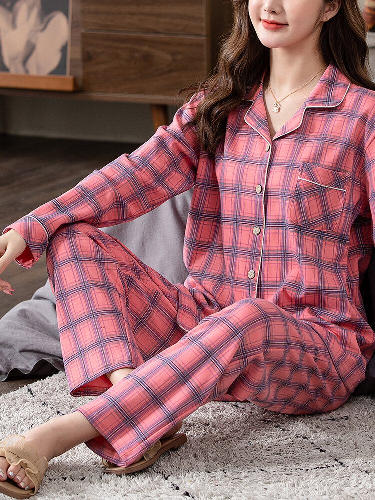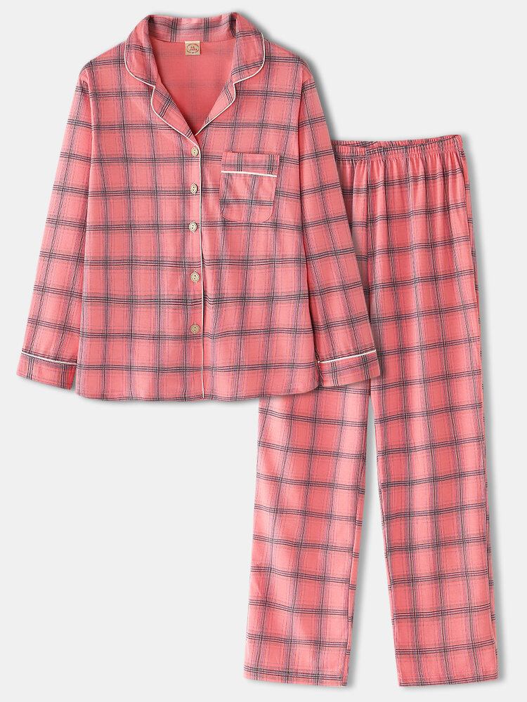Kvinder Plaid Print Revere Krave Brystlomme Skjorte Elastiske Taljebukser Todelt Pyjamassæt