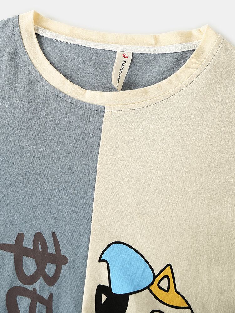 Kvinder Tegneserie Kat Print Tofarvet Patchwork Elastisk Talje Lommebukser Hjemmepyjamas Sæt