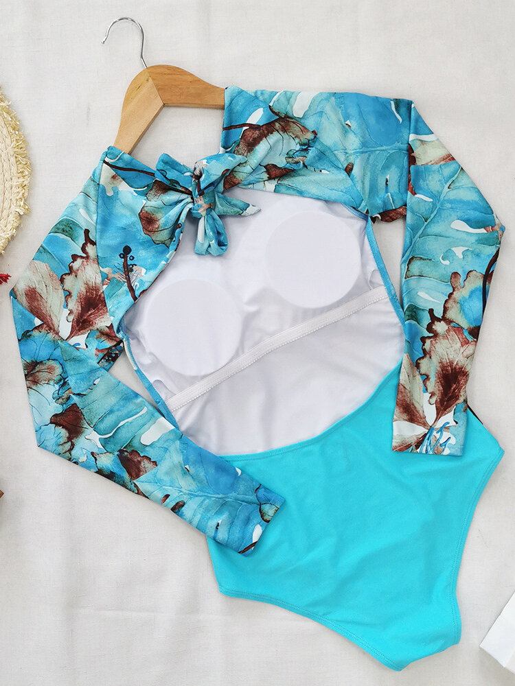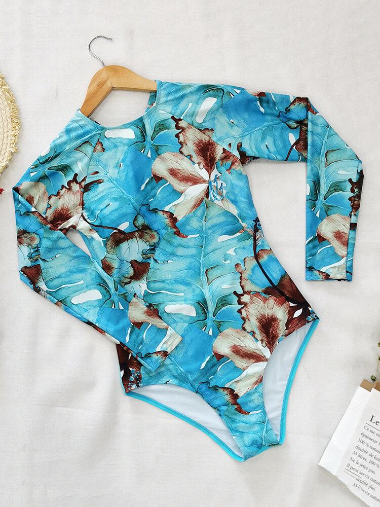 Kvinder Tropical Plant Print Højhalset Rygløs Langærmet Slankende Surfing One Piece Badedragt