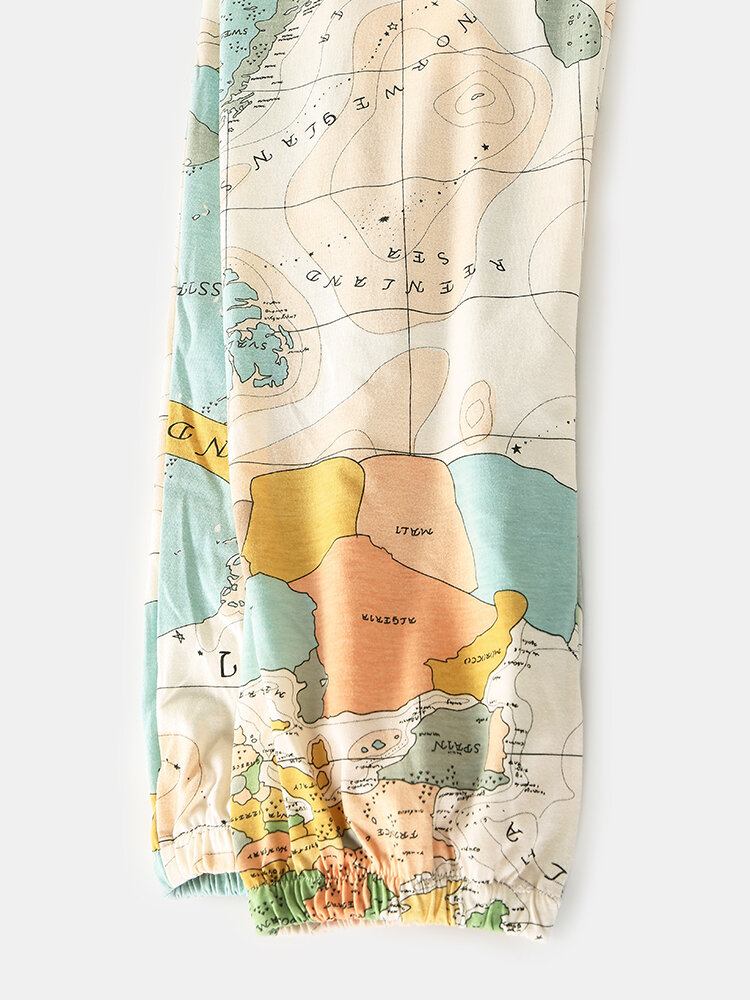 Kvinder Verdenskort Print Rundhals Elastisk Talje Joggerbukser Hjemmepyjamassæt