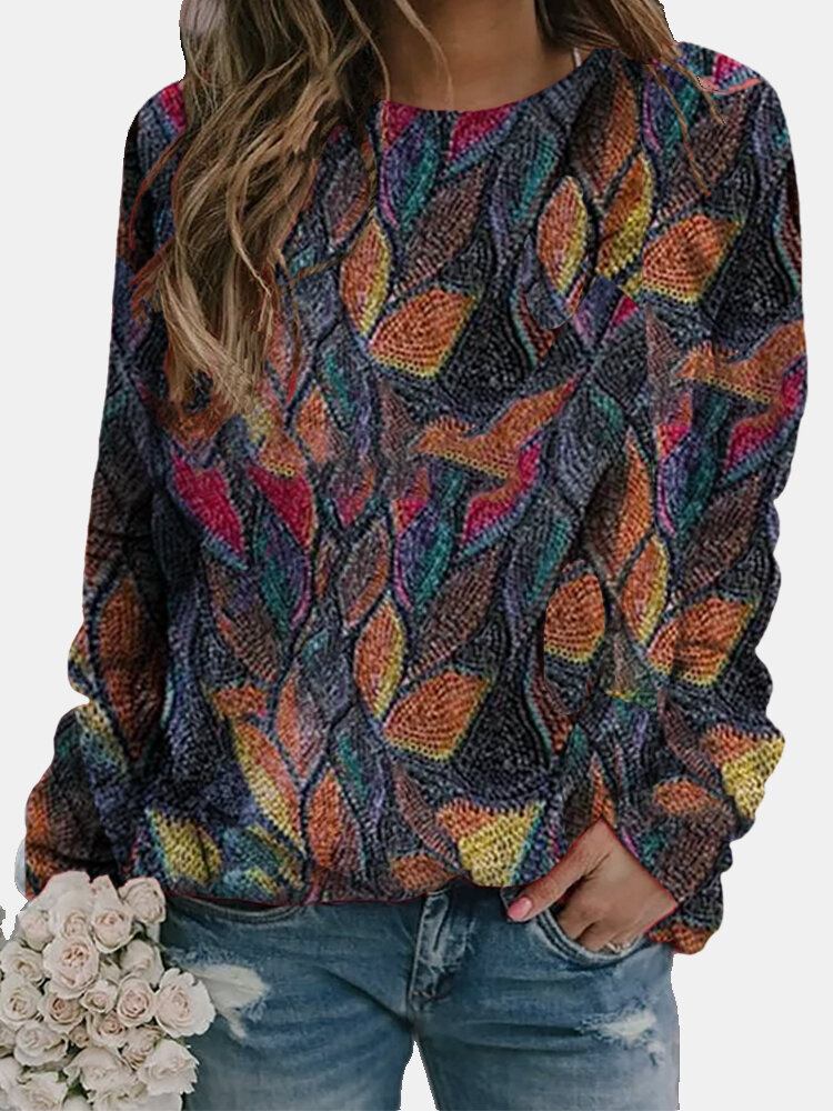 Kvinder Vintage Farverige Blade Trykt Rund Hals Langærmet Afslappet Sweatshirt