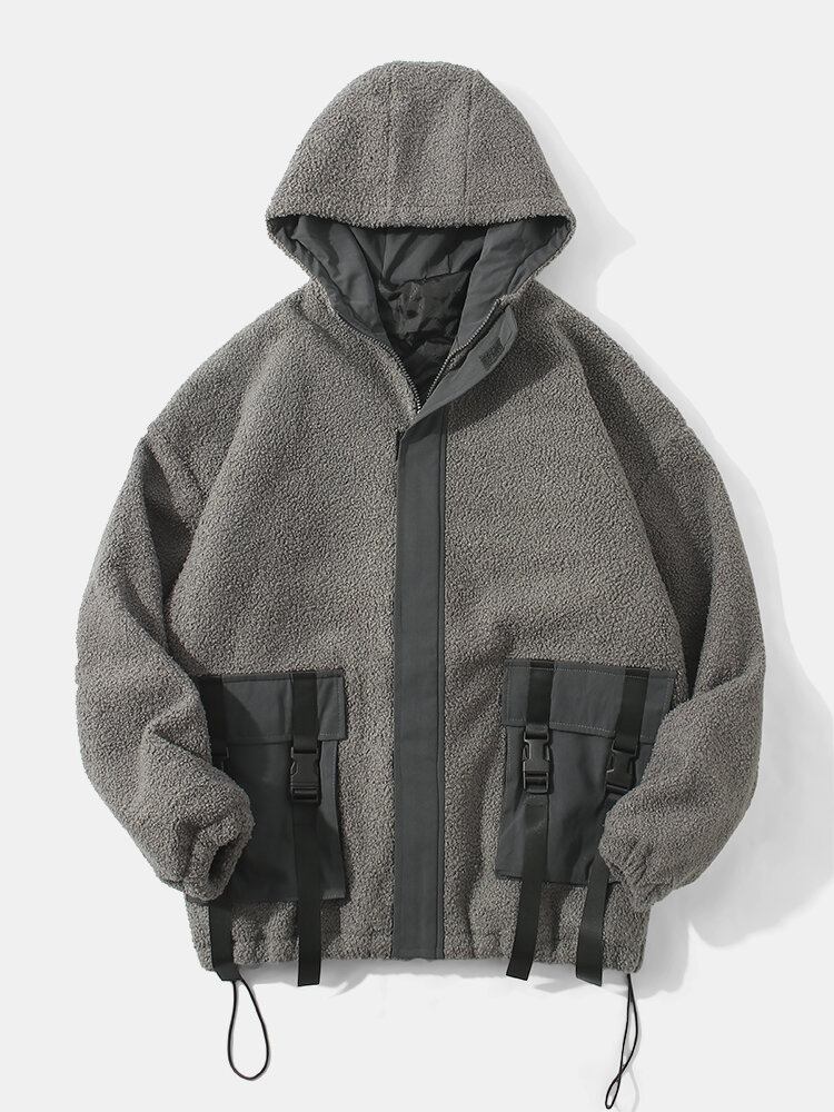 Langærmet Patchwork-jakke Til Mænd Med Dobbeltlomme I Plys Hætte