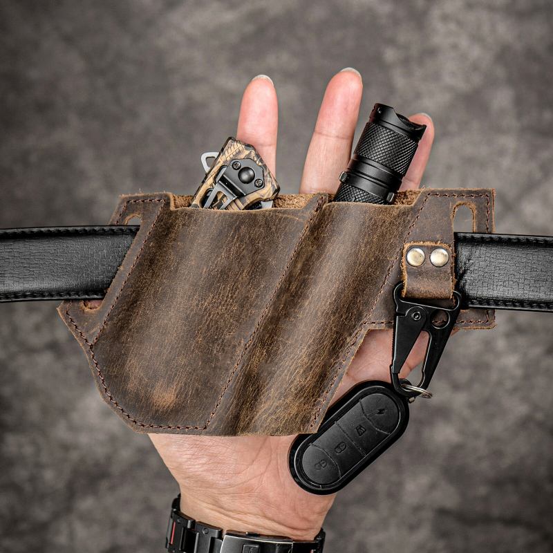 Mænd Ægte Læder Edc Multitool Lommelygte Nøgle Foldekniv Organizer Taljebæltetaske