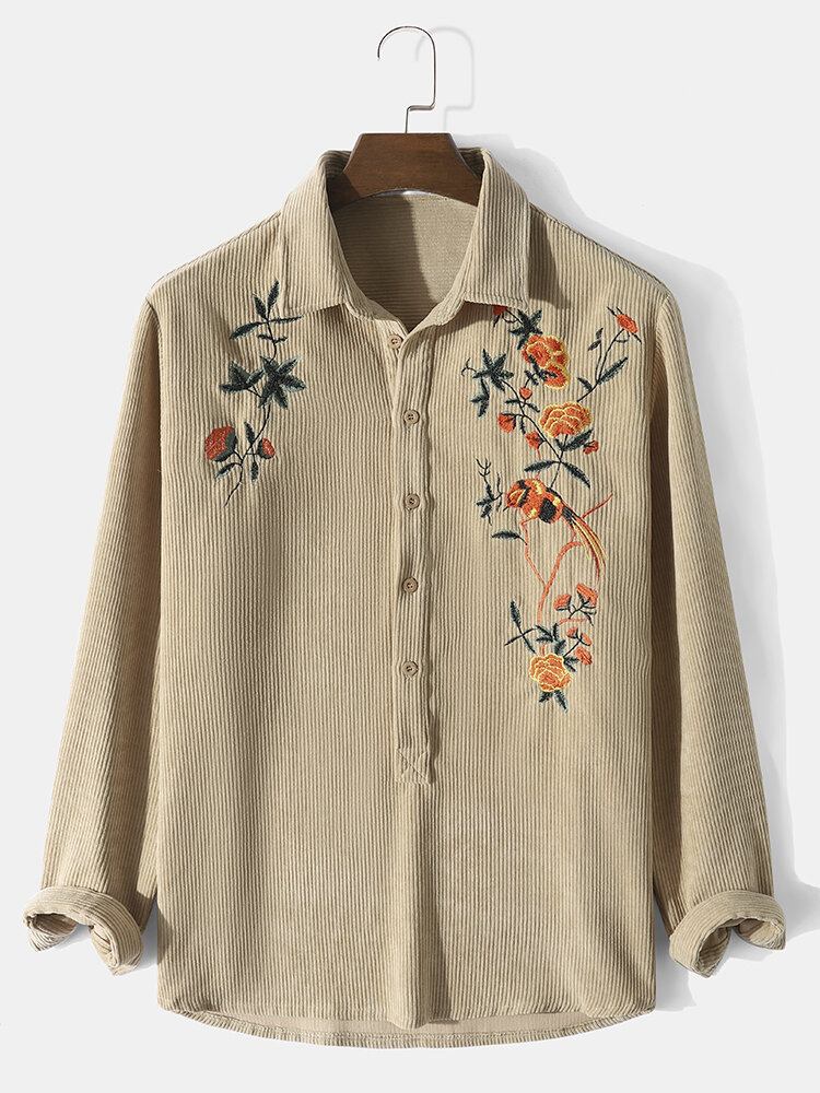 Mænd Ensfarvet Broderi Blomstret Fløjlslange Langærmede Knapper Casual Henley Skjorter