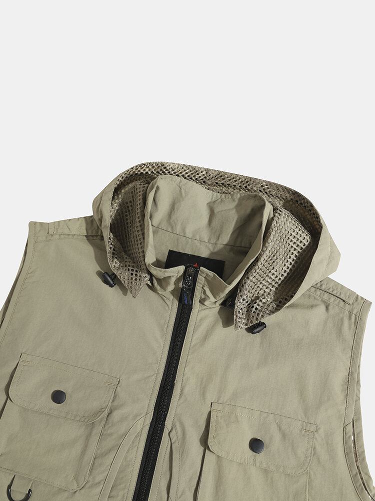 Mænd Solid Justerbar String Front Lynlås Mesh Foret Multi Pocket Cool Veste