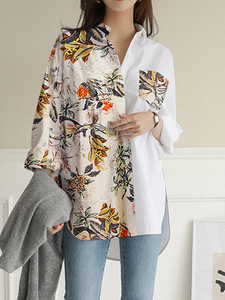 Planter Flower Print Pocket Langærmet Lapel Button Down Skjorte