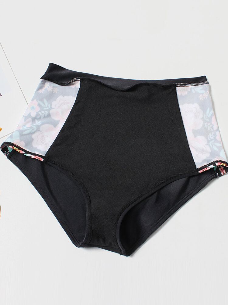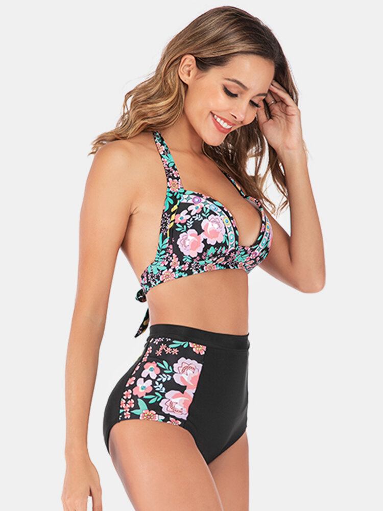 Plus Size Dame Floeal Print Patchwork Højtalje Bikini Rygløst Badetøj