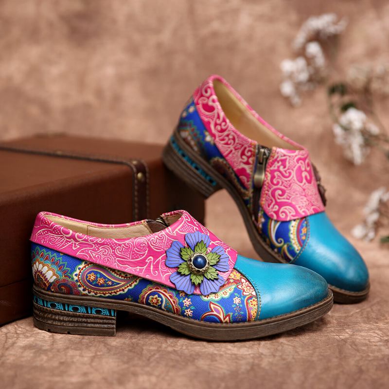Retro Læder Paisley Splejsning Blomsterprægede Behagelige Ægte Læder Flade Sko