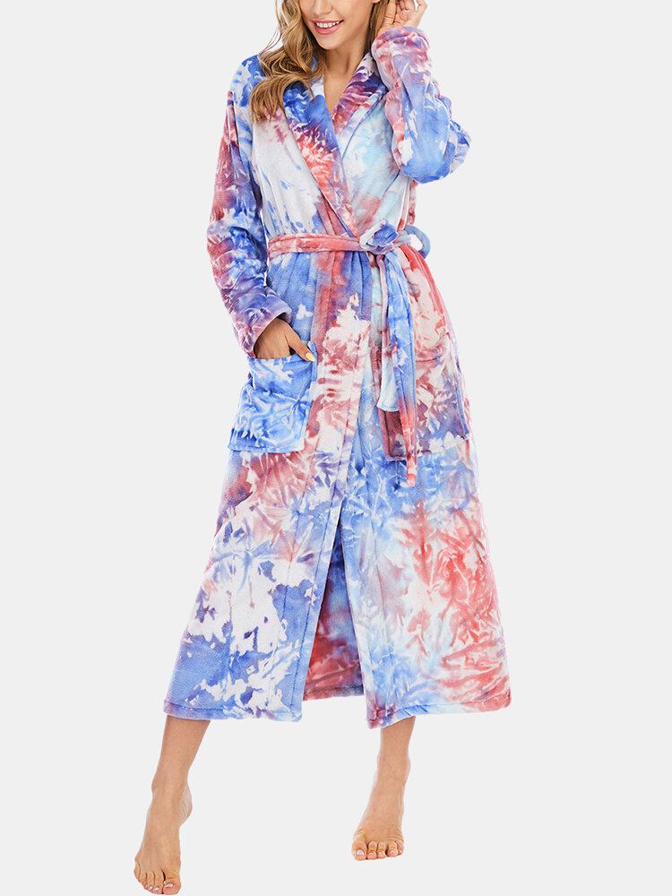 Tie Dye Dame Flanell Langærmet Dobbeltlomme Hjem Nattøj Badekåber