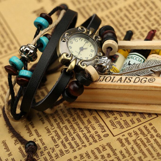 Vintage Okselæder I Retrostil Flerlags Kvartsur Weave Feather Pendant Læderarmbåndsur