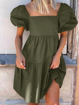 Kvinder Pufærme Firkantet Krave Ren Farve Knælang Kjole Med Lynlås Bagpå